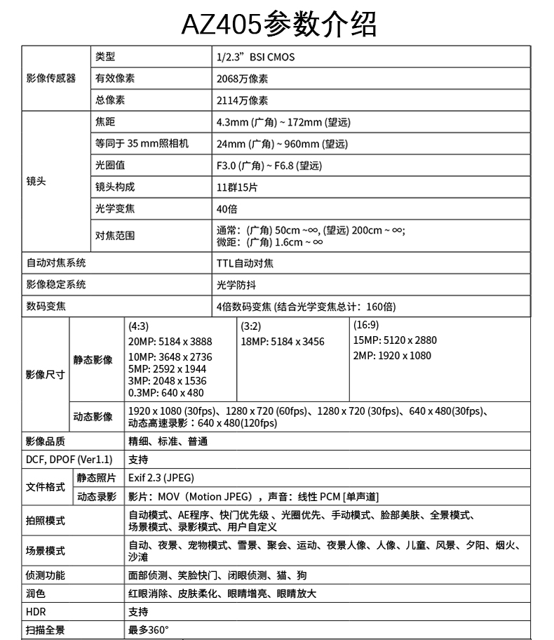 光学变焦(值):40倍有效像素(值):2068万显示屏尺寸(值):3英寸