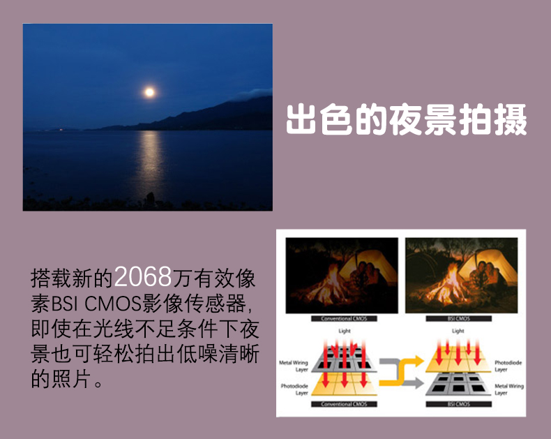 防抖性能:光学防抖高清摄像:全高清(1920x1080)最大光圈:F6.8(望远)